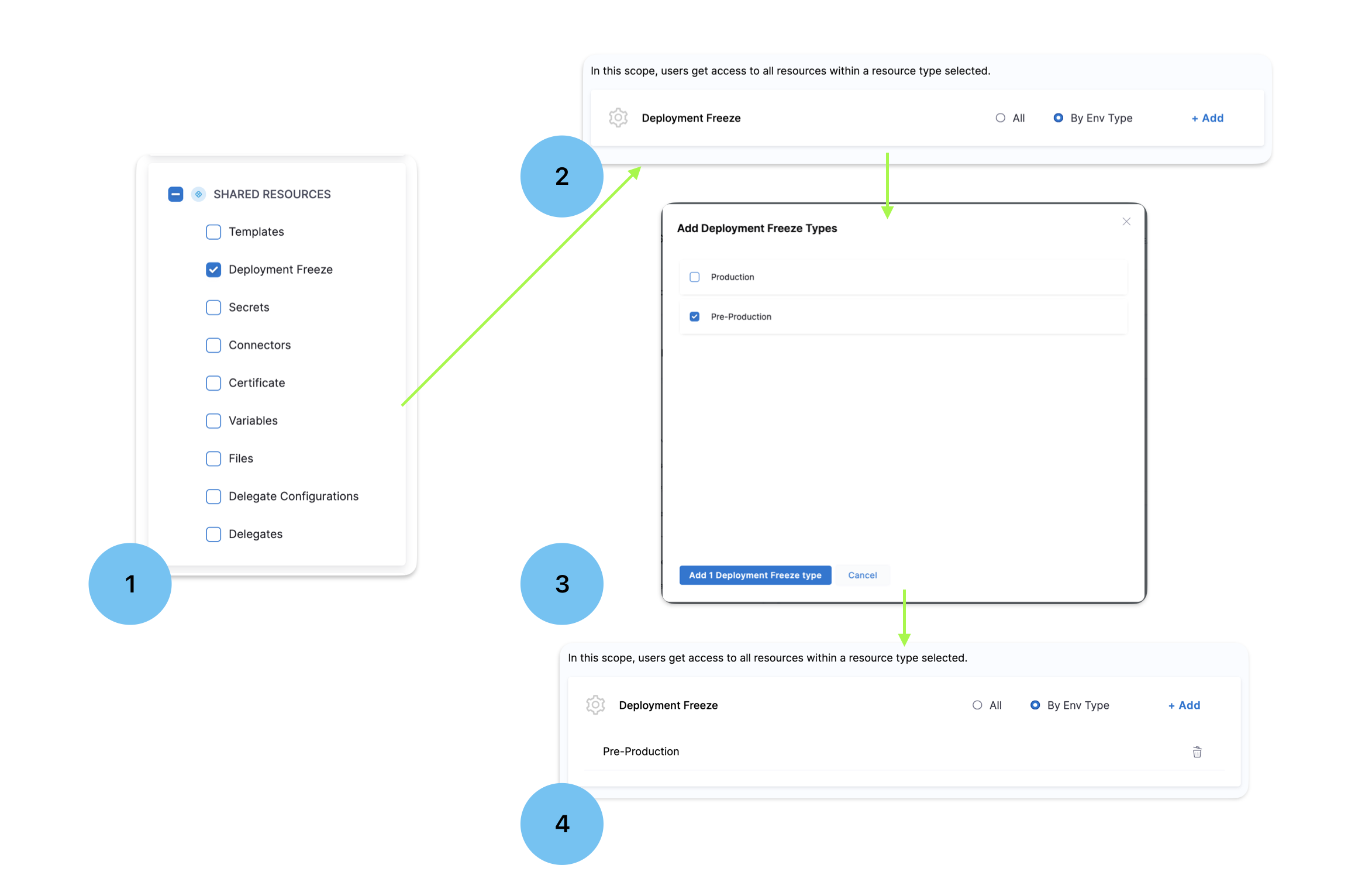 Previously, access to Deployment Freeze Windows could only be controlled at a higher level (e.g., across all environments). Now, you can assign specific roles to freeze deployments only in production or only in pre-production environments.