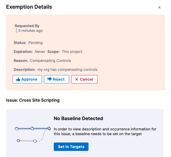 For exemptions without a configured baseline target, the Set in target button (previously leading to a 404) has been removed. Instead, a direct link to the relevant target on the Test Targets page is now provided (STO-9715, STO-9556).